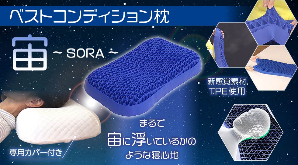 ベストコンディション枕 宙(SORA)は、TPE(熱可塑性エラストマー)素材を採用した、包み込まれるようなフィット感と通気性が特徴の枕です。